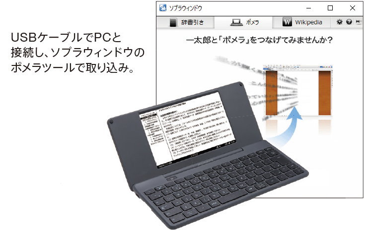 株式会社キングジムのデジタルメモ「ポメラ」シリーズをパソコンに接続して、一太郎のソプラウィンドウからメモを取り込むことができます。