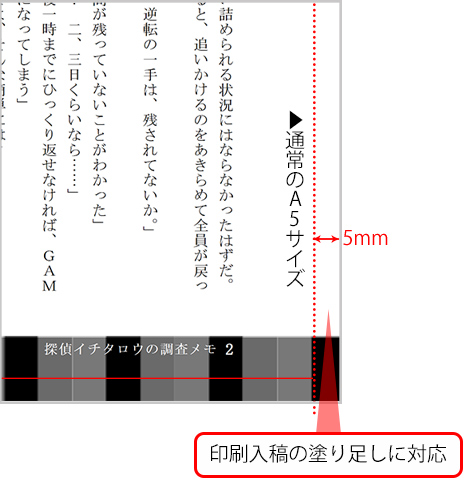 | 塗り足し(ぬりたし) | 仕上がりサイズよりも外にある、製本時に裁ち落とされる部分。断裁位置ずれに備えて、塗り足しを加えた大きさの用紙サイズでの入稿データ作成を指定されることがある。このとき、用紙の背景などは、塗り足しまではみ出すように作っておく。 |