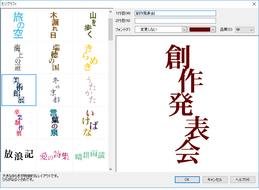 統合グラフィックソフト「花子Personal」には、グラフィカルでアートなタイトル文字が作成できる「モジグラフィ 花子プラス」が搭載されています。 また、「バラエティ用紙」には冊子作りに最適な「表紙」「カバー」「帯」も搭載されているので、表紙周りの一式を作成できます。