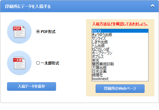 文書を作成できたら、印刷所に入稿して、美しく印刷・製本してもらってはいかがでしょう。印刷所で冊子を印刷する際の入稿データを作成するために[入稿データを保存]します。「PDF形式」または「一太郎形式」を選んで保存します。同人誌など、印刷に対応する印刷会社を一覧表示できるので、Webページで入稿形式などを確認しておきましょう。