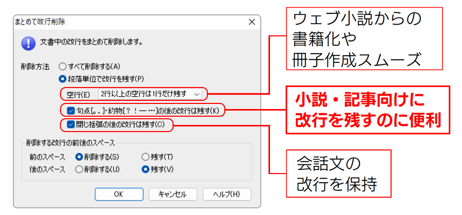 小説投稿サイトなどでは、読みやすさのために空行が多用されますが、冊子や書籍にしたいときには空行を減らし、紙幅をコンパクトにする必要があります。空行をまとめて削除する「まとめて改行削除」は、対象となる文章に合わせて設定も充実。