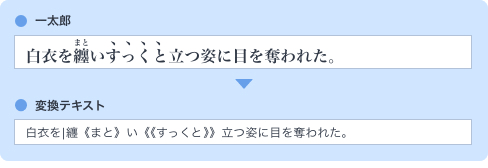 テキストを読み込む際、テキスト内にふりがなや傍点の形式で記述された文字列を解析し、自動的に、一太郎文書上でふりがなや傍点を設定できます。