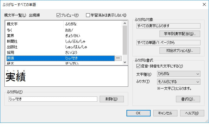 一太郎[書式-ふりがな]の[すべての単語]や[1単語の設定/変更]でルビを設定 | |