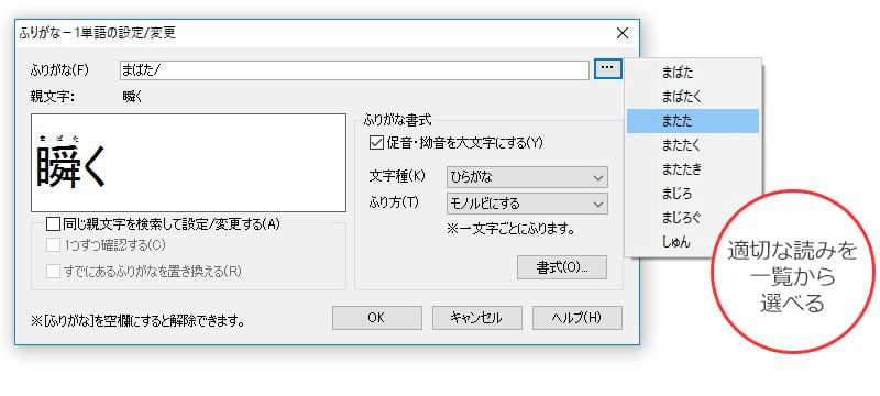 小説の執筆でよく使われる、ふりがな設定の利便性を高めています。親文字に読みの候補が2つ以上ある場合に、読みが一覧表示され、正しい読みの候補を選択して置き換えることができます。