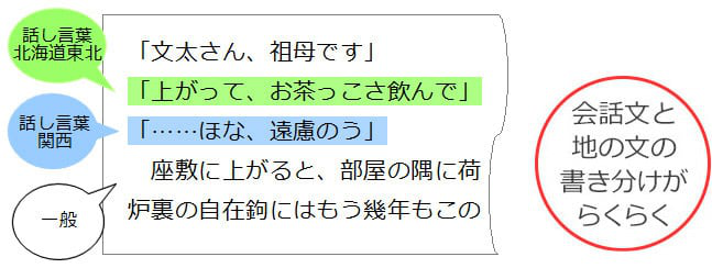 好みのキーに割り付けることで、ワンタッチでの切り替えが可能となり、執筆効率が向上、方言を話す登場人物の会話文なども書きやすくなります。
