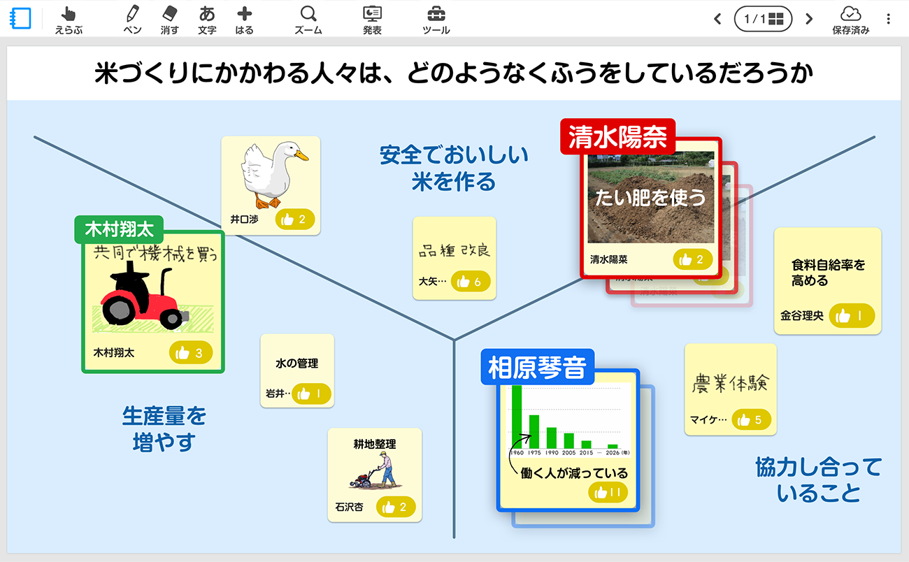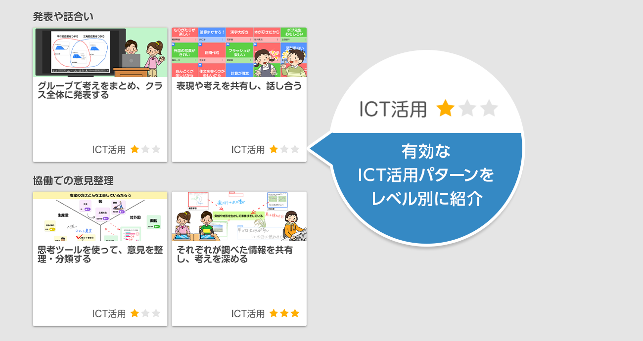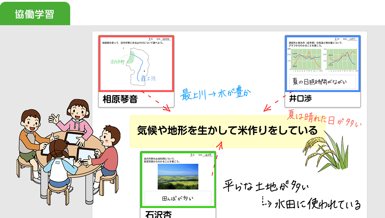 思考テンプレートやふせんなど、活発に意見交換できる仕掛けを用意し、全員参加の協働学習を実現します。