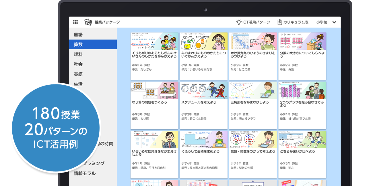 03日常的なICT活用授業ができる | 授業パッケージICTを活用した授業の略案や教材がセットになっているため、事前準備に時間をかけず、1人1台PCを活かした授業がすぐにできます。