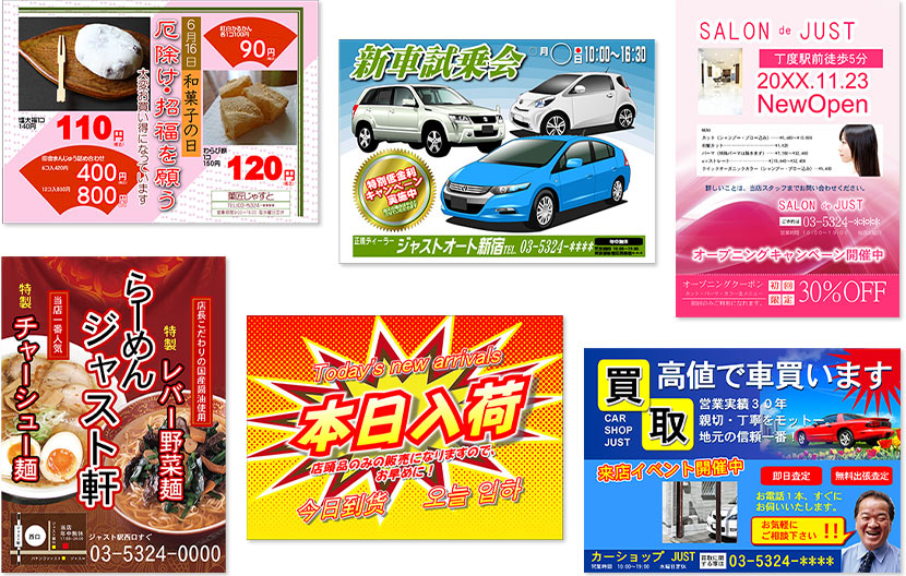 「セールチラシ」よりも、端的かつ印象的に訴えたい内容を伝えられるアイテムです。割引価格やセールのお知らせなど、お客様にとっても嬉しい内容は、目に留まるデザインでより効果的にアピールしましょう。