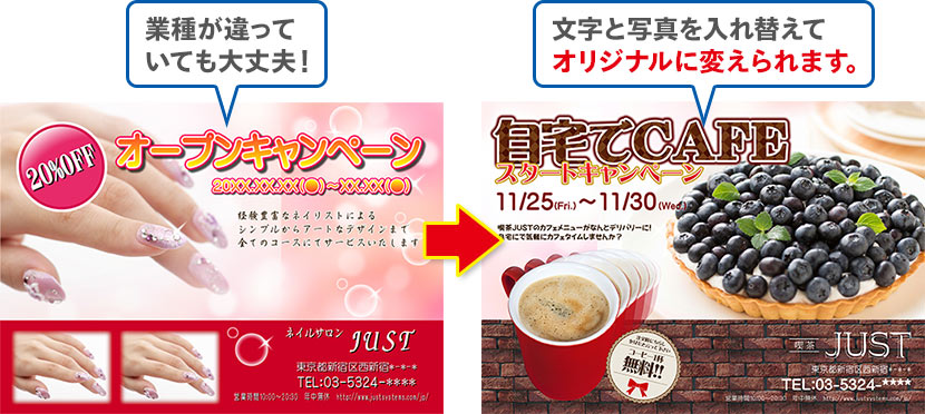 さまざまな販促アイテムをご用意。メニューからかんたんに作りたいものを選べます。そのままでも使える高品質なデザイン。もちろん文字や写真を入れ替えて、かんたんに必要としている販促内容にアレンジすることもできます。
