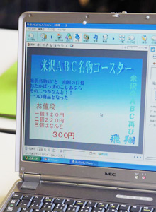 「はっぴょう名人」でチラシ作り。“米沢のABC”とは、米沢の特産品である舘山林檎(apple)、米沢牛(beef)、米沢鯉(carp)を意味する。