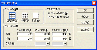 まず、画面に、「グリッド」という方眼を表示します。グリッドを使うと、正確な座標に合わせて図形を描画したり、移動したりする場合に便利です。 プルダウンメニューの[表示]−[表示切り替え]−[グリッドの表示]を選択すると、グリッドが表示されます。 グリッドが表示されたら、プルダウンメニューの[表示]−[表示設定]−[グリッドの設定]を選択し、「グリッドの表示」と「グリッドにスナップ」にチェックし、描きたいコース幅になるように設定します。ここでは10mm幅を3分割に設定します。 |