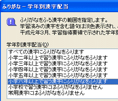| 小学生向けの教材やプリント作成に欠かせない「ふりがな」。一太郎では、一括で、それも学年別の配当漢字にしたがってふりがなをふることができます。 | ||||||||||
