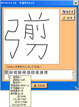 「手書き入力」機能を搭載。読みがわからない漢字をマウスで書いて検索し、入力することができます。 |