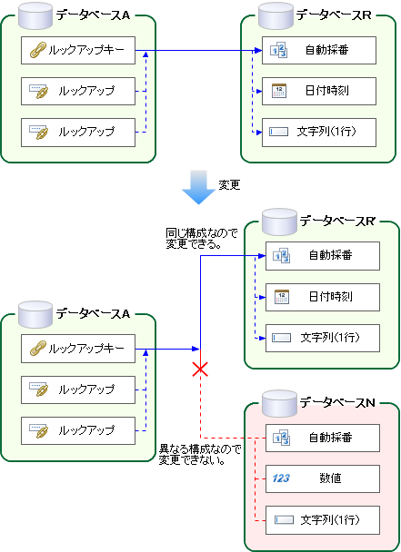 ルックアップキーフィールドの参照先は、ルックアップキーフィールドや関連付けられたルックアップフィールドのフィールド設定が、変更前と変更後とで同じ構成となるときに変更できます。