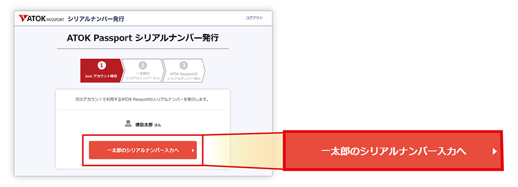Just アカウントの登録が完了したら、[ATOK Passportのシリアルナンバー発行に進む]をクリックします。